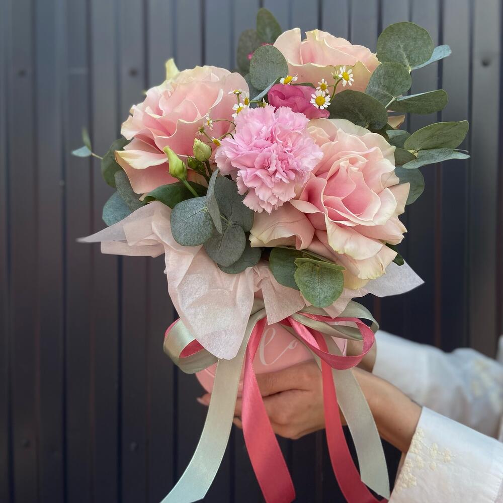 Нежная и воздушная композиция из французских роз, эустомы и диантуса в шляпной коробке