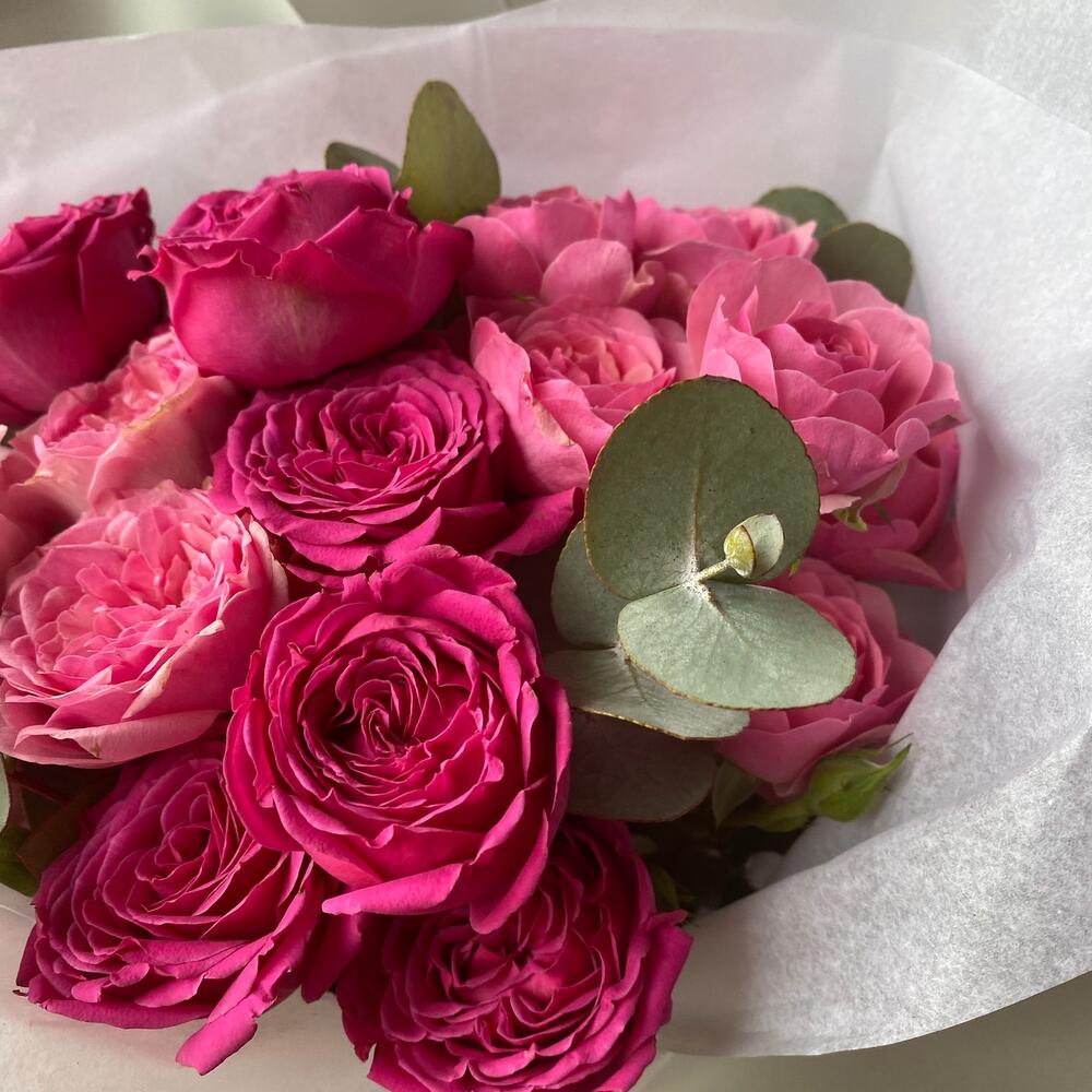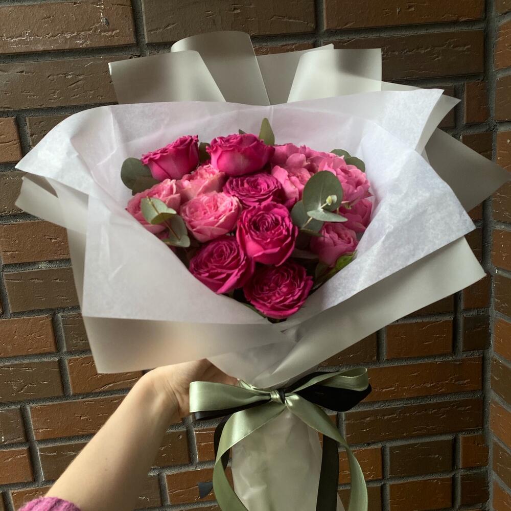 Роза кустовая – 4 шт.Эвкалипт – 2 шт.Лента атласная – 2 шт.Упаковка дизайнерская – 7 шт.