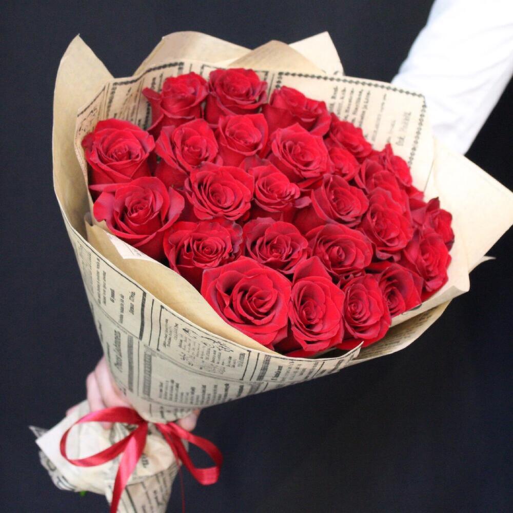 Роза Эксплорер – 25 шт.Крафт дизайнерский – 2 шт.Лента атласная – 1 шт.