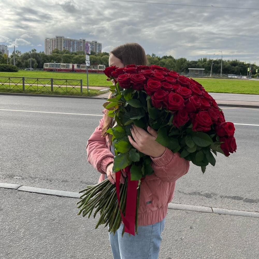 Роза красная – 101 шт.Упаковка дизайнерская – 1 шт.