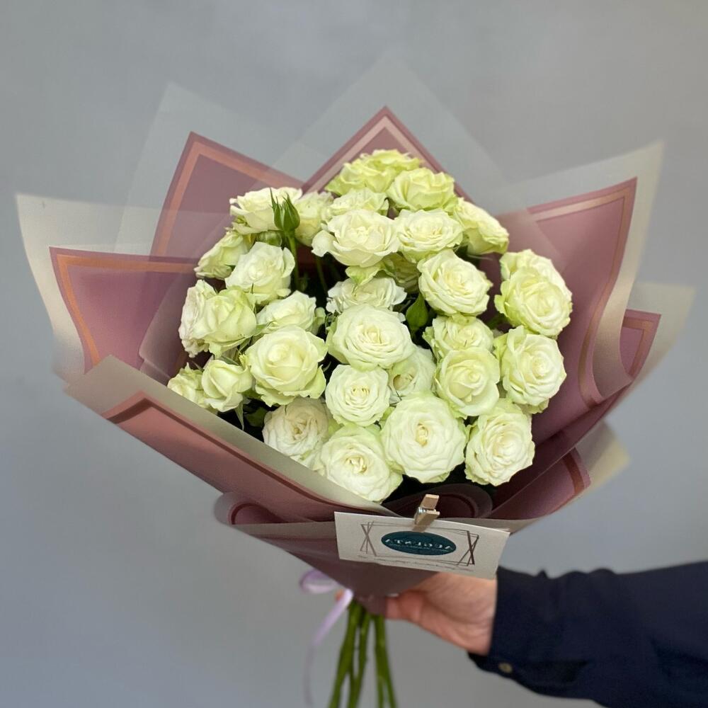 Роза кустовая – 7 шт.Упаковка дизайнерская – 1 шт.Лента атласная – 1 шт.