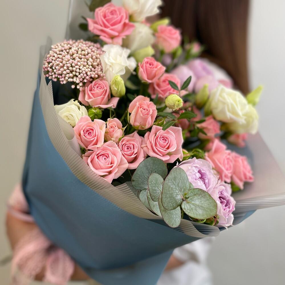 Кустовая роза – 2 шт.Эустома – 2 шт.Фисташка – 1 шт.Упаковка дизайнерская – 2 шт.Райсфлауэр – 1 шт.Эвкалипт Baby Blue – 1 шт.Кустовая роза пионовидная – 3 шт.