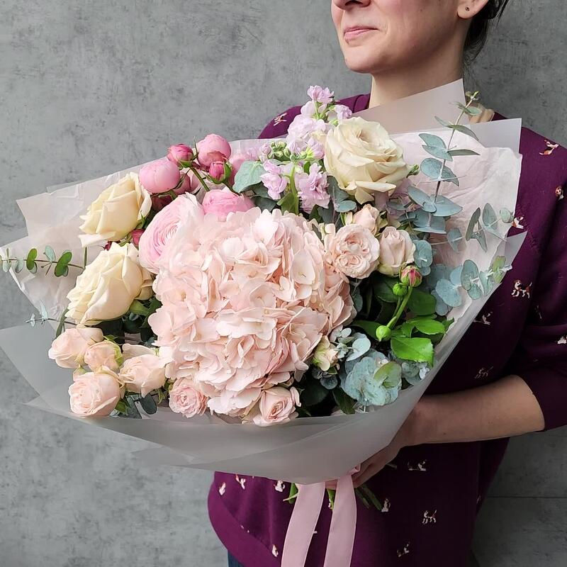 Нежный букет из гортензий, роз и пионов