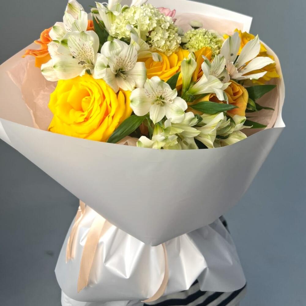 Альстромерия – 3 шт. Вибурнум – 1 шт. Роза – 6 шт.