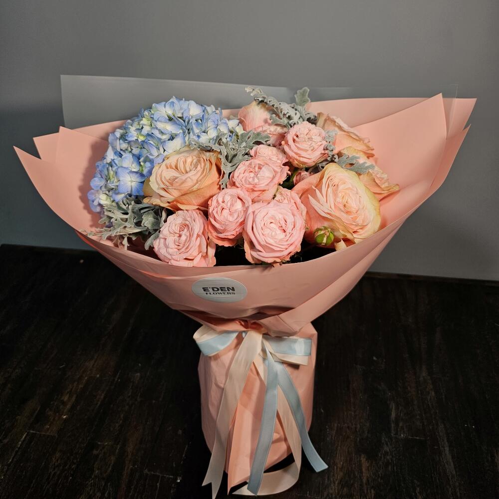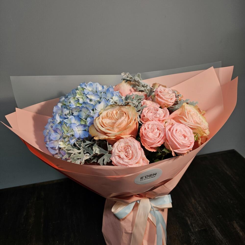 Альстромерии, Гортензии, Кустовые розы, Лизиантусы, Розы, Хризантемы