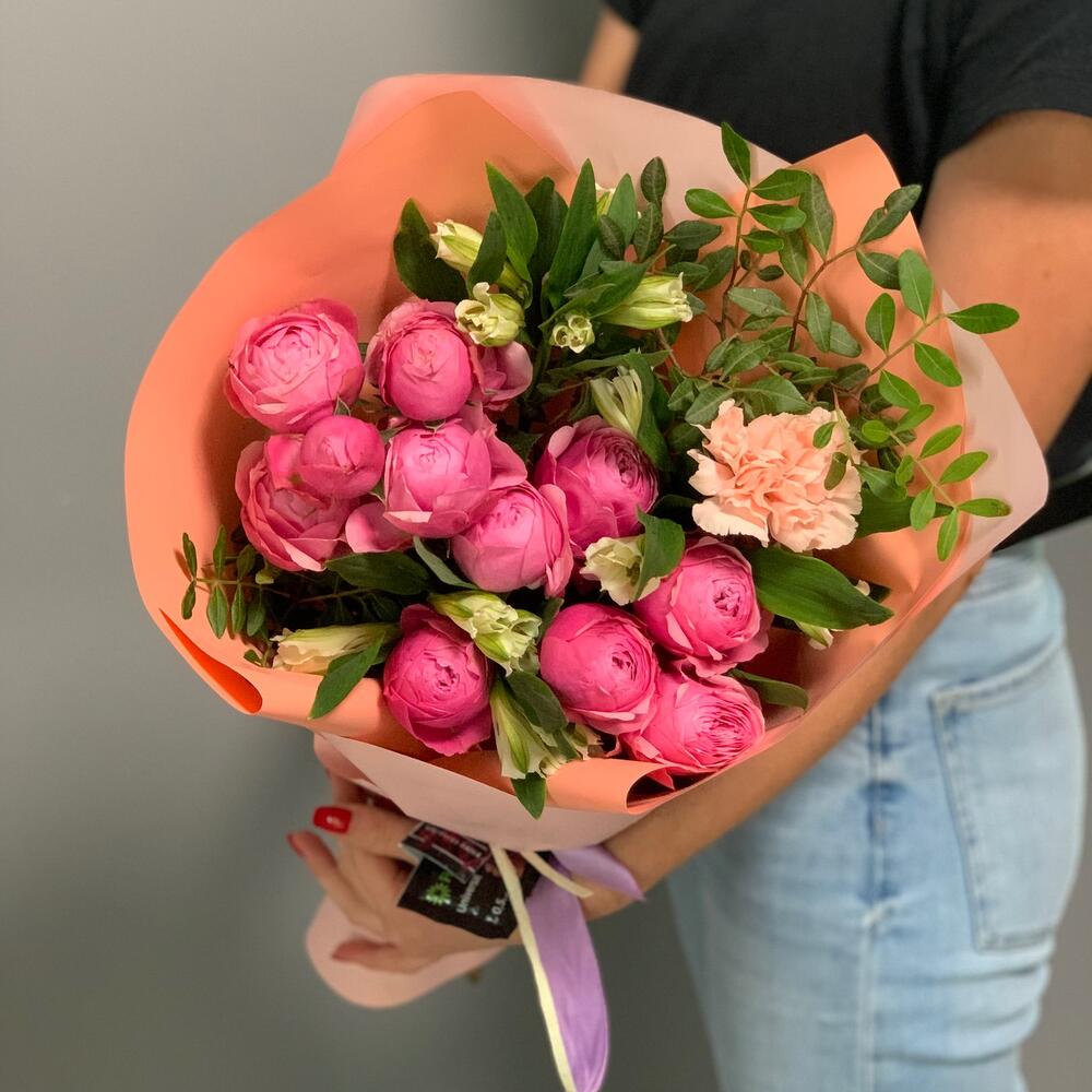 кустовая пионовидная роза сильвия пинк – 2 шт. Альстромерия – 3 шт. Гвоздика – 1 шт. Писташ – 1 шт.