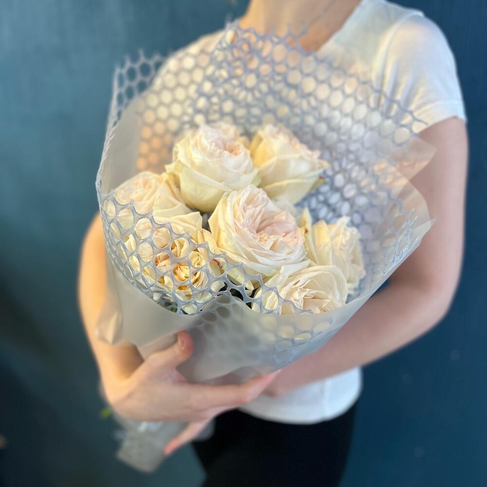 Стильный монобукет из ароматной розы White O,hara c нежной сетке