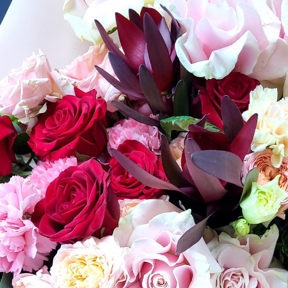 Гвоздики, Кустовые розы, Пионовидные розы, Розы