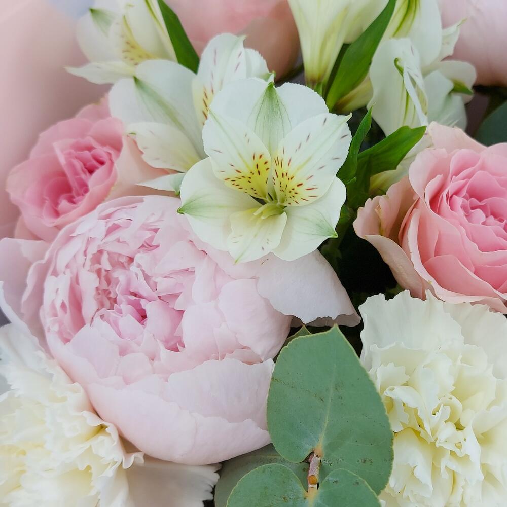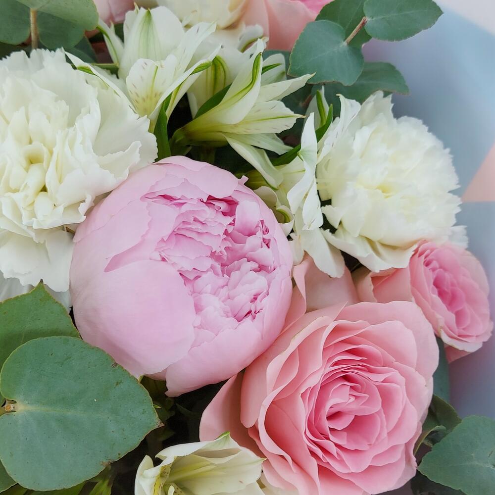 Альстромерия – 3 шт.Пион – 3 шт.Эвкалипт – 7 шт.Роза одноголовая – 9 шт.Упаковка дизайнерская – 1 шт.Пистация – 3 шт.гвоздика сортовая (диантус) – 7 шт.