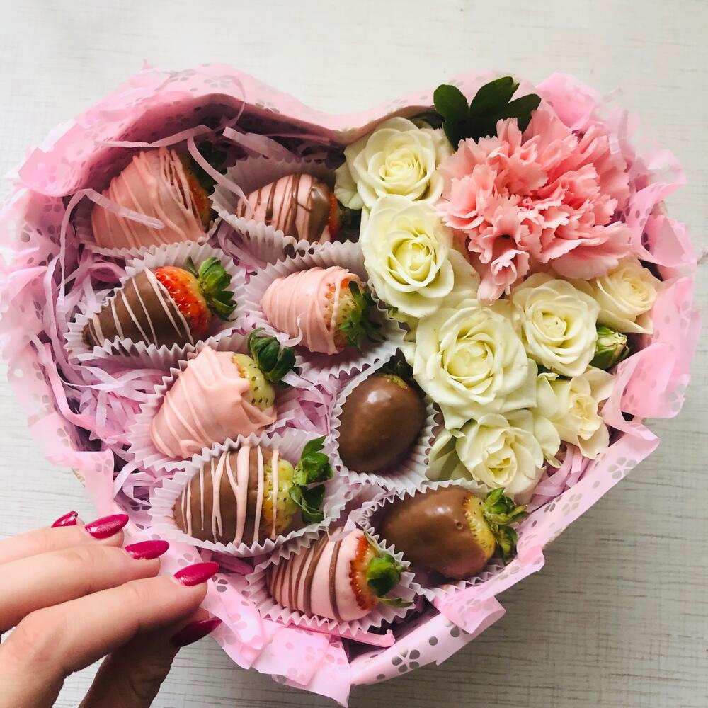 Роза кустовая – 3 шт.Диантус – 1 шт.Коробка – 1 шт.Клубника в шоколаде – 9 шт.
