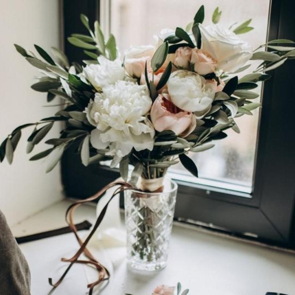 Пион белый – 3 шт.Фисташка пучок – 2 шт.Кустовая роза пионовидная – 3 шт.Роза одноголовая эквадор 40 см – 3 шт.олива зелень – 4 шт.садовая одноголовая роза – 2 шт.шнурок кожаный – 2 шт.
