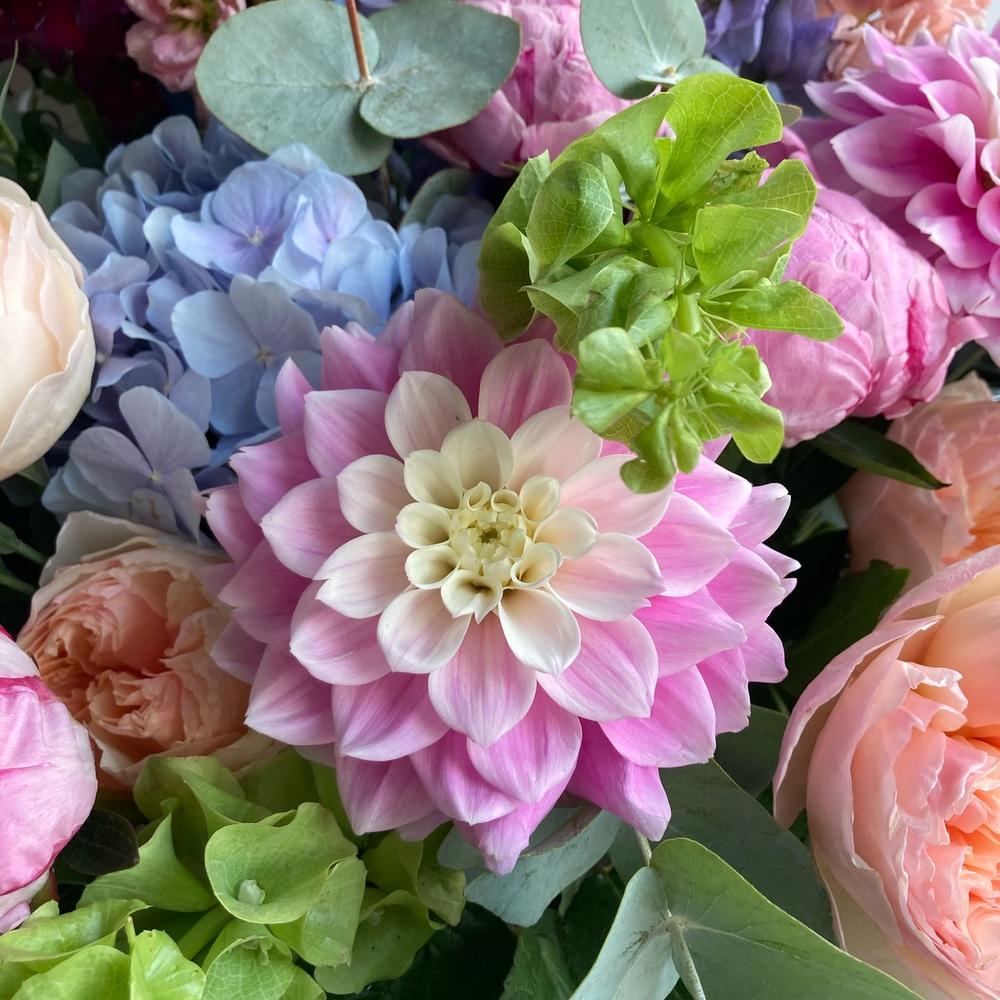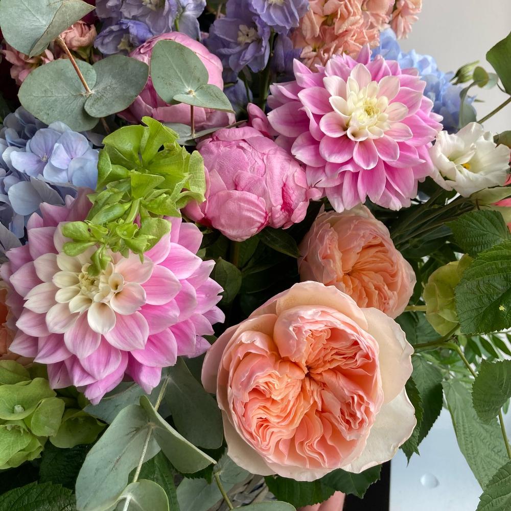 Душистая, садовая корзина с дельфиниумом, георгинами, гортензиями, пионовидными розами, маттиолой, львиным зевом, ирландскими колокольчиками, малиной и эвкалиптом.