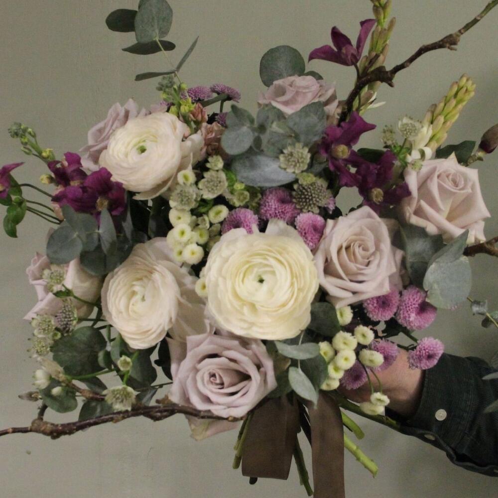 Букет с характером и душистым нежным составом, ветки, ранункулюсы, клематис, тубероза, сантини, эвкалиптом, розами и астранцией.