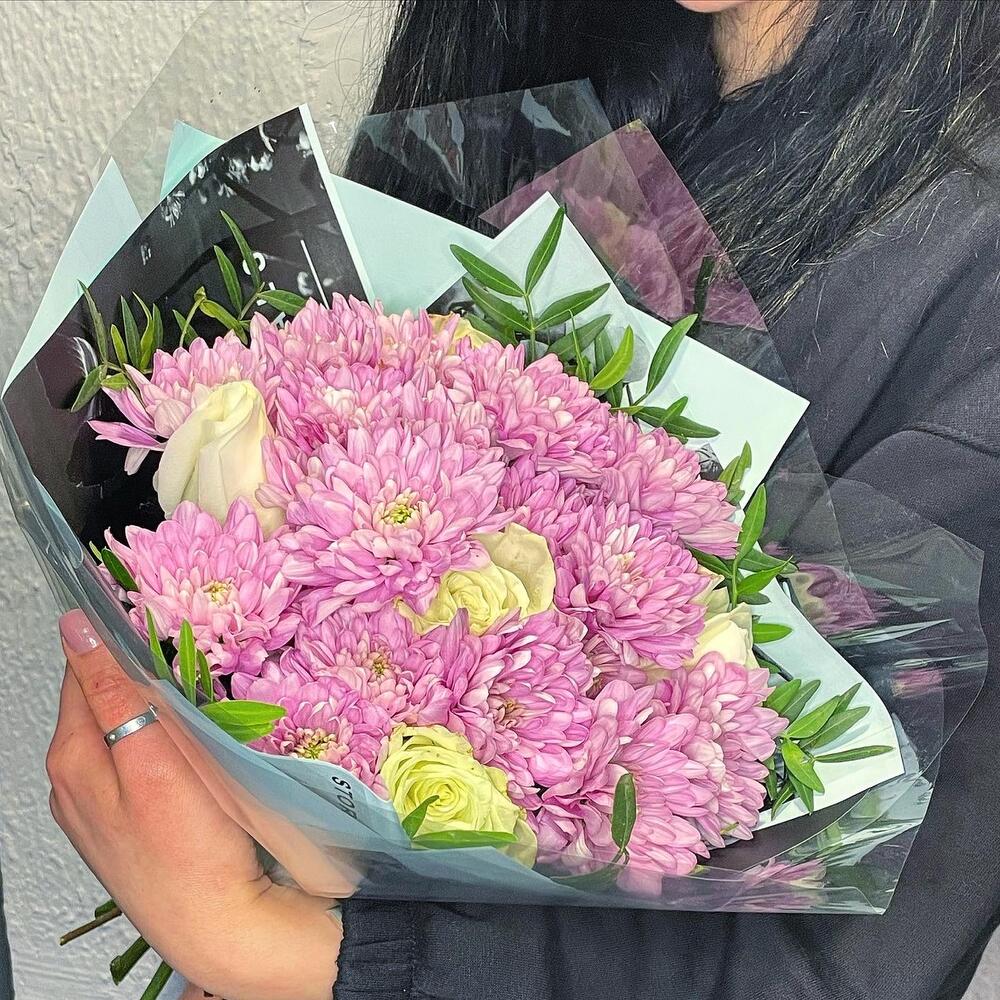 Хризантема кустовая – 4 шт.Роза Эквадор – 5 шт.фисташка зелень – 4 шт.Упаковка дизайнерская – 2 шт.