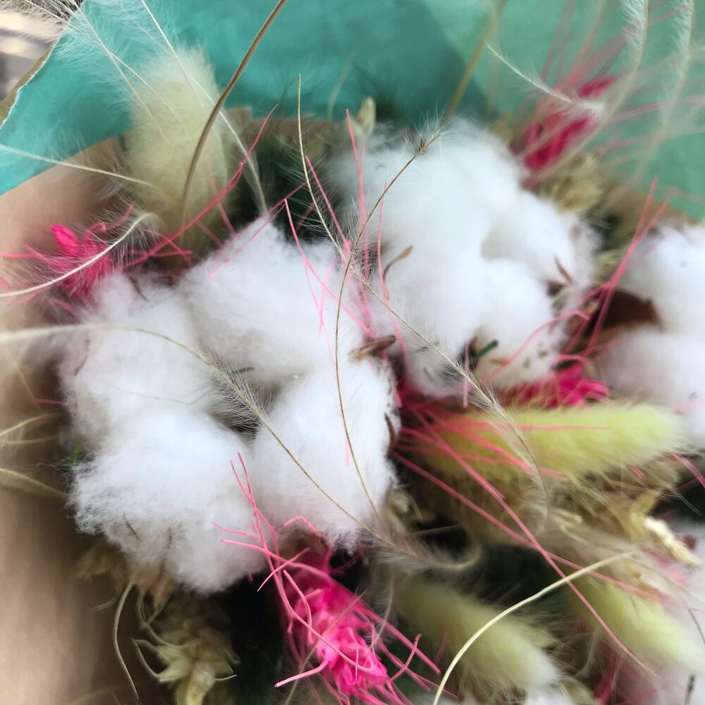 Хлопок – 5 шт.Атласная лента – 1 шт.Пшеница пучок – 2 шт.Дизайнерская упаковка – 1 шт.лагурус пучок – 1 шт.ковыль пучок – 1 шт.