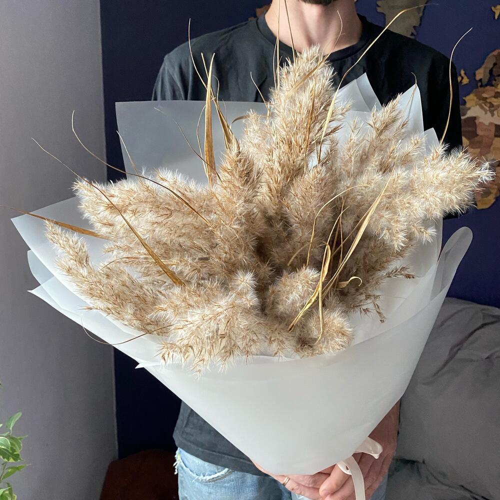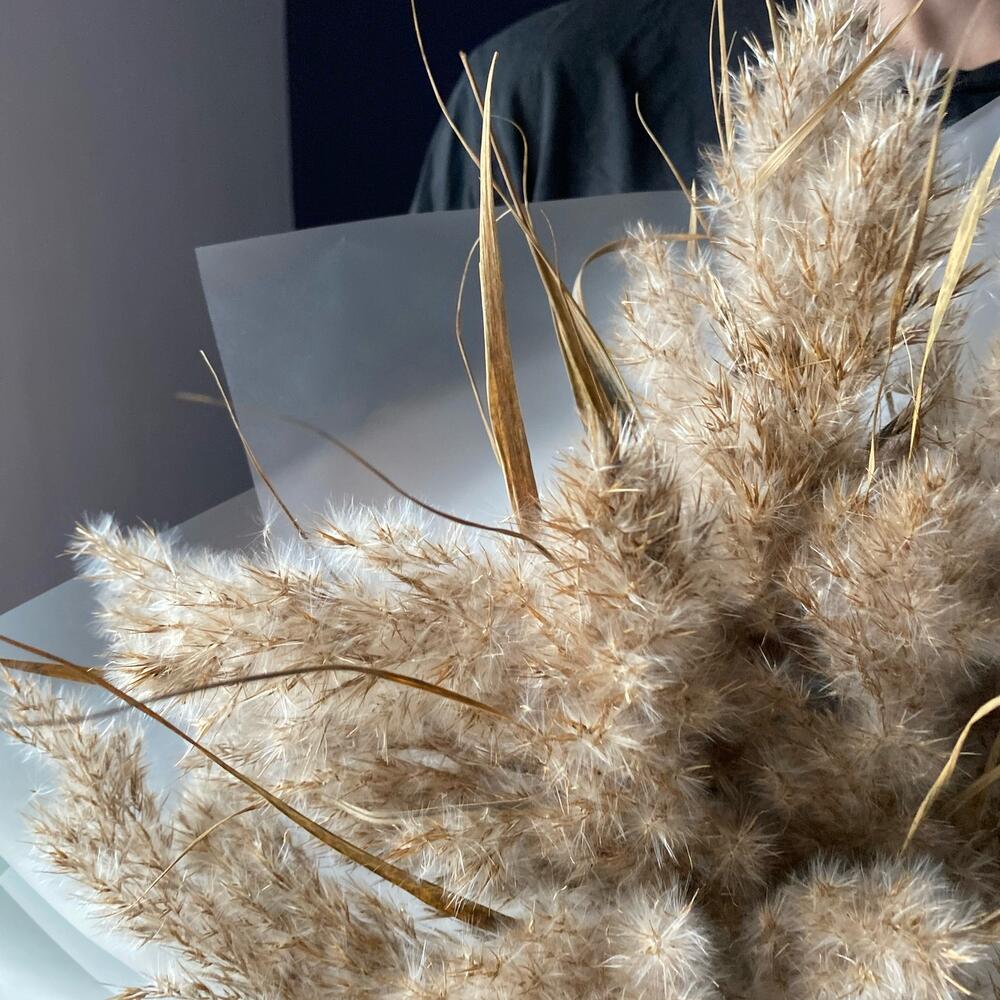 Сухоцветы – 15 шт.Матовая пленка – 5 шт.Лента атласная – 1 шт.