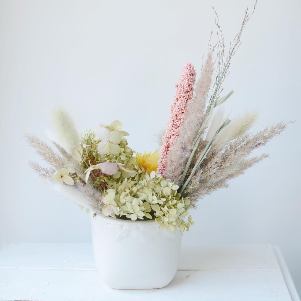 Сетария – 3 шт.Кашпо керамическое – 1 шт.Оазис для сухоцветов – 1 шт.гортензия сухоцвет – 1 шт.камыш декоративный пучок – 1 шт.нарцисс сухоцвет – 2 шт.лагурус микс пучок – 1 шт.