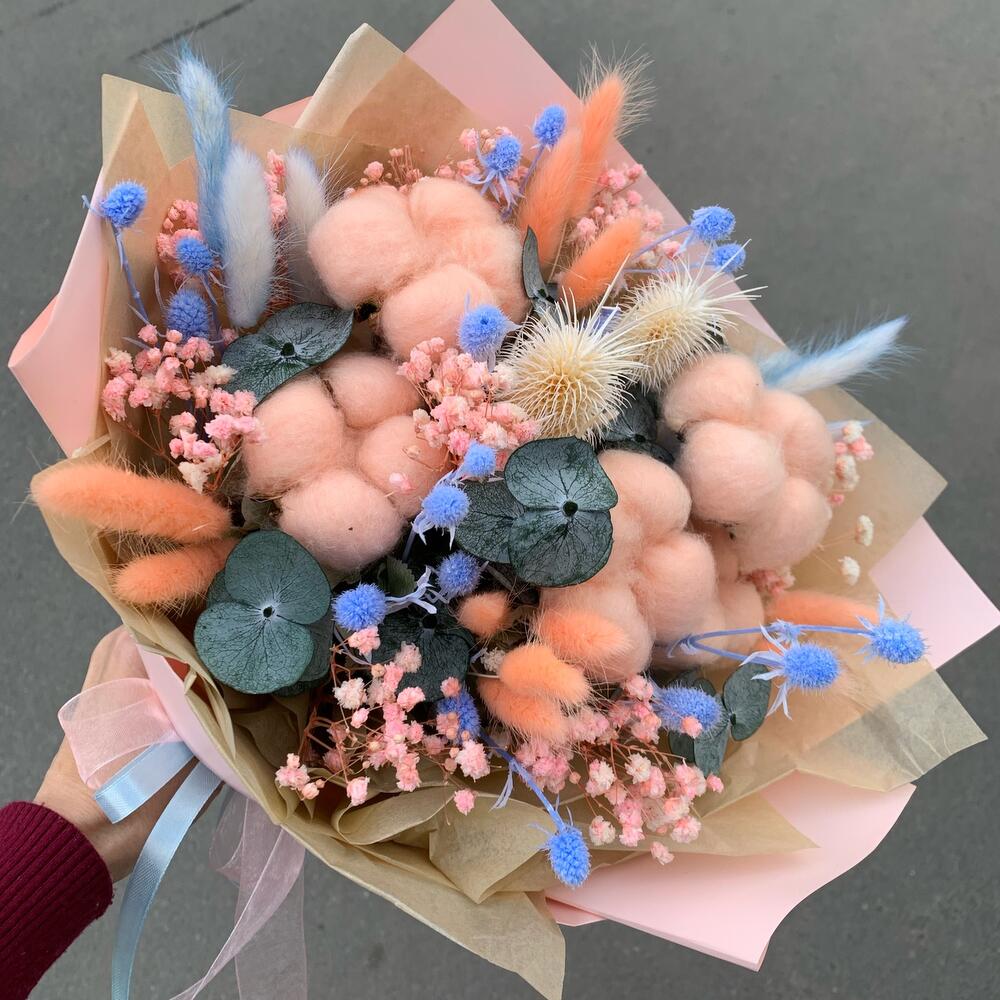 Хлопок (сухоцвет) – 5 шт.синеголовник стабилизированный – 7 шт.Эвкалипт стабилизированный – 6 шт.Гипсофила – 1 шт.Лагурус – 17 шт.эрингиум выбеленный – 2 шт.гортензия сухоцвет – 1 шт.тишью натуральная – 1 шт.Пленка матовая – 1 шт.Лента атласная – 2 шт.