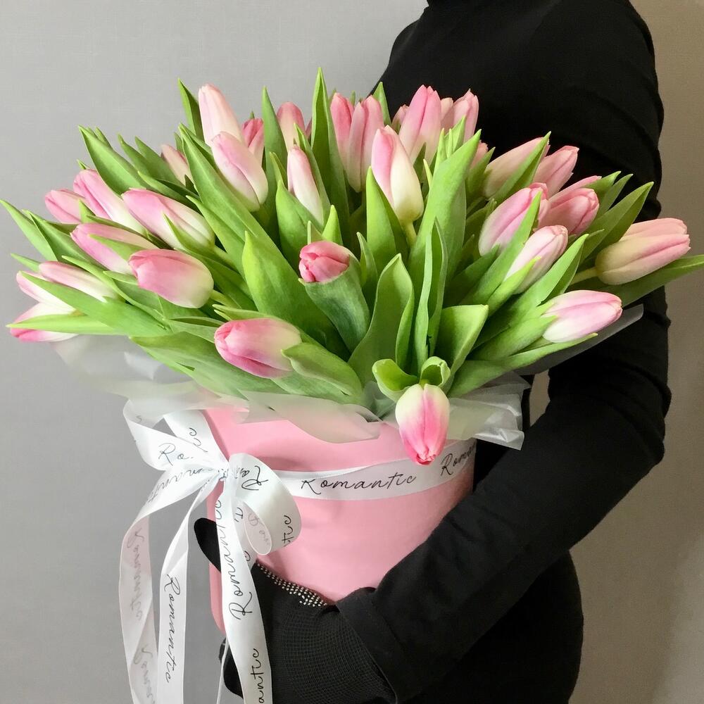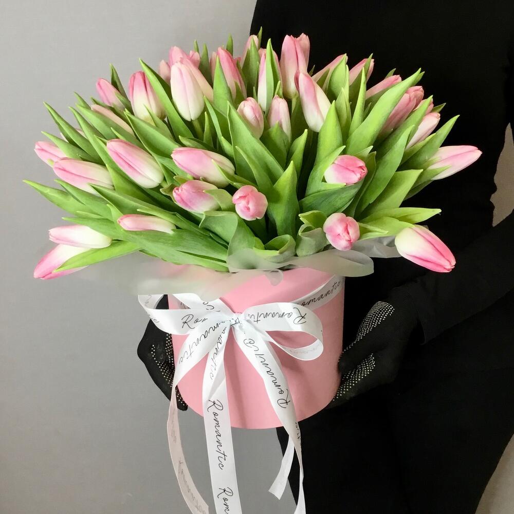 51 тюльпан в аквабоксе и в шляпной коробке