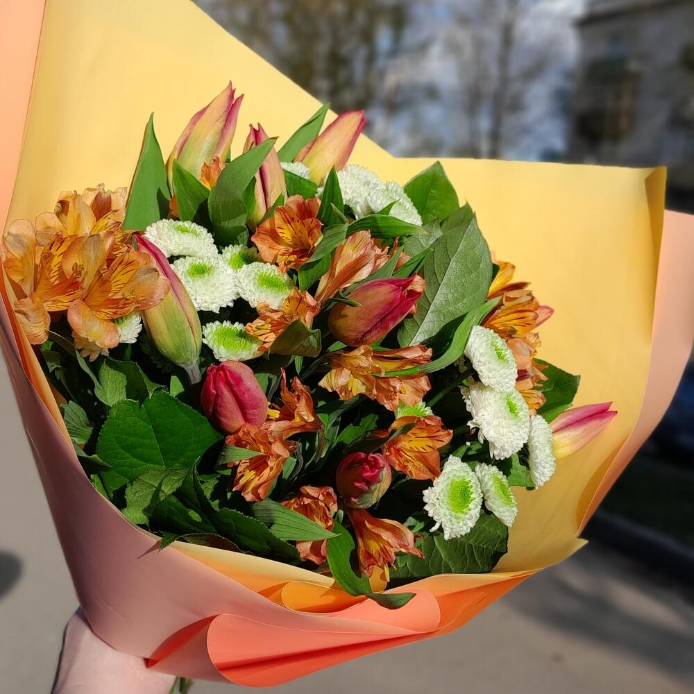 Альстромерия – 7 шт.Салал – 3 шт.Тюльпан – 9 шт.Лента атласная – 2 шт.Сантини – 3 шт.Упаковка дизайнерская – 3 шт.